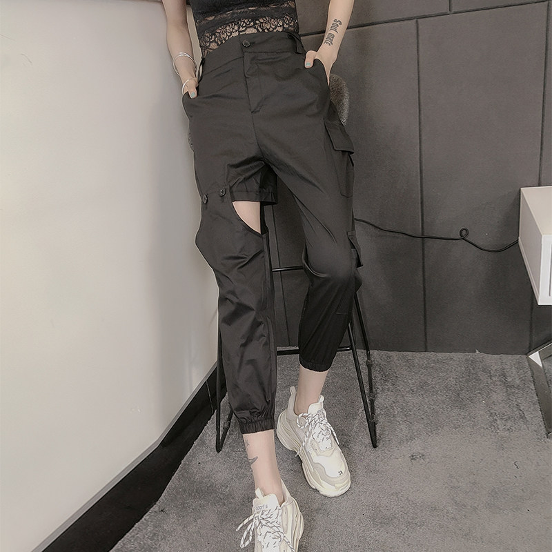 工装裤女显瘦高腰2021新款韩版宽松设计感束脚裤七分裤黑色裤子潮热门设计联盟服务商