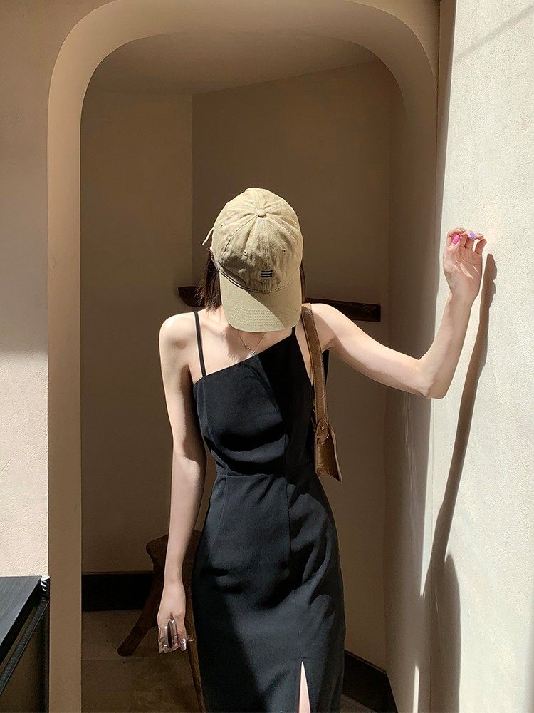 法式开叉吊带裙女2021夏季新款内搭连衣裙显瘦设计感性感小黑裙潮热门设计联盟服务商