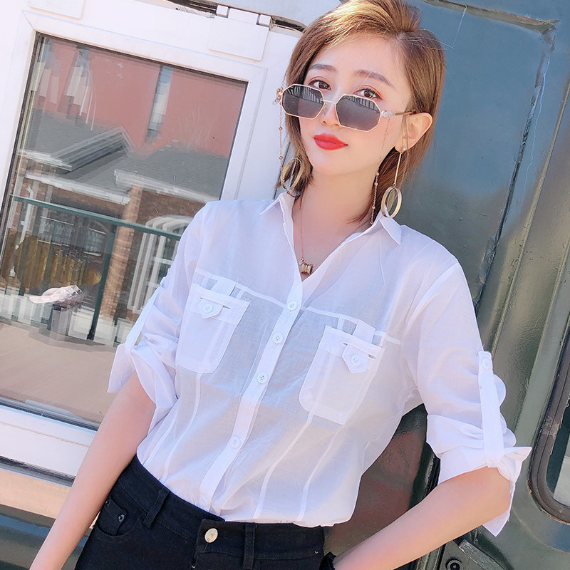 薄款白色衬衫女2020夏新款V领七分袖轻薄透气防晒衫职业工装衬衣热门设计联盟服务商