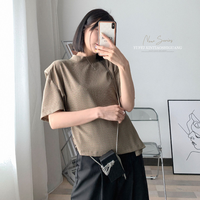 2021夏新款显瘦格子上衣设计师款高级复古短袖不规则直角肩t恤女热门设计联盟服务商