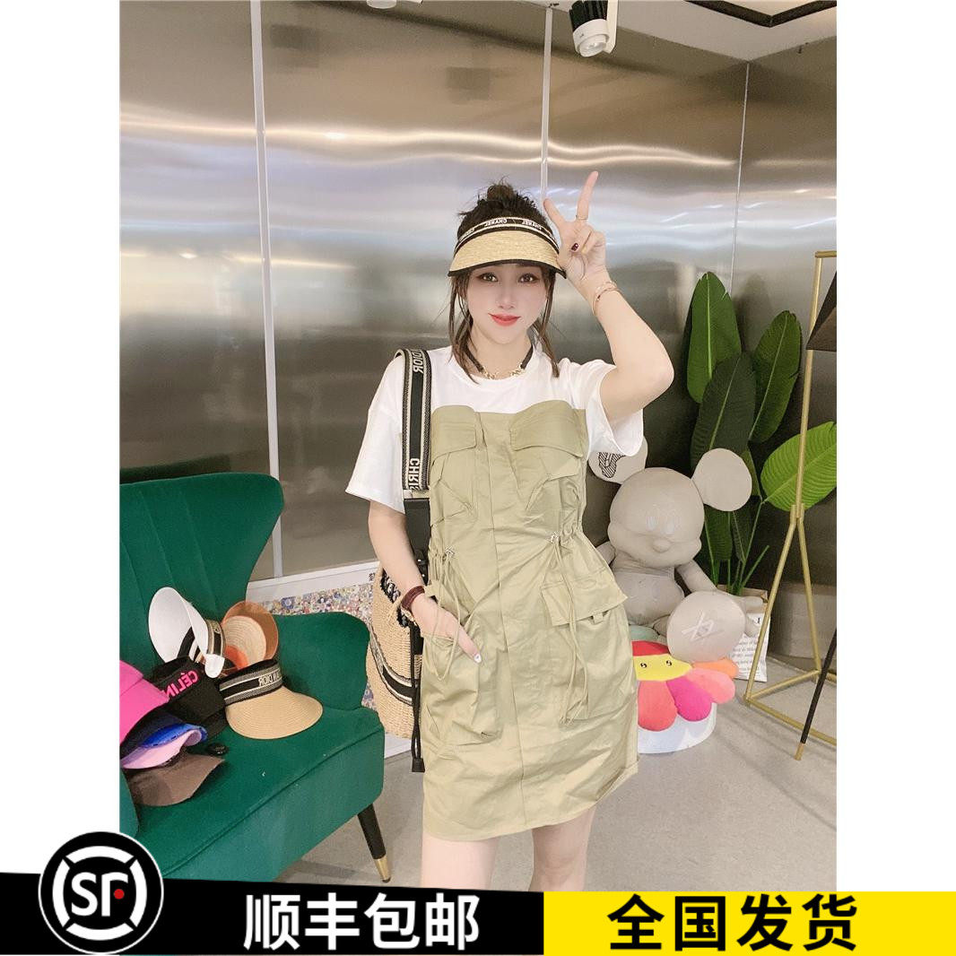 欧洲站2021春季新款百搭时尚圆领拼接工装抽绳大口袋连衣裙女潮J热门设计联盟服务商